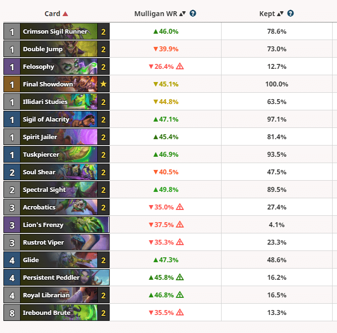 - Cards to never keep in mulligan: “Lion’s Frenzy”, “Felosophy”, “Irebound Brutes”, and “Acrobatics”.